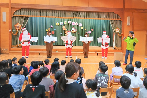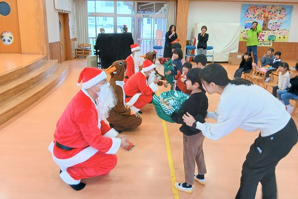サンタクロースとトナカイの登場とともに、プレゼントを受けとった園児たちは大喜びでした。