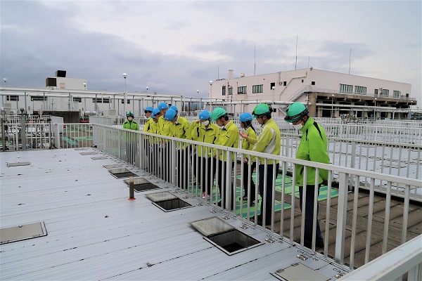 公社の秋里下水終末処理場にて、水処理施設の心臓部であるエアレーションタンクを見学しました。